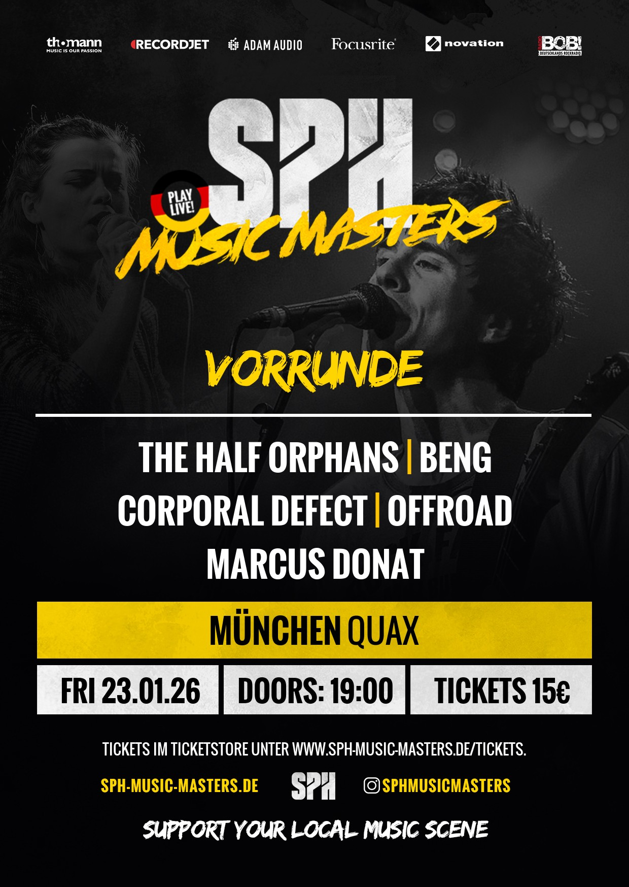 FRI 23.01.26 rocken wir zusammen mit anderen Bands in der Vorrunde des SPH MUSIC MASTERS. Seid mit uns in München dabei, klickt auf TICKETS und sichert Euch den Vorverkaufspreis von 15€.